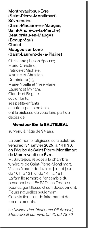 Cet espace « condoléances » est dédié à la mémoire de Monsieur Emile SAUTEJEAU.