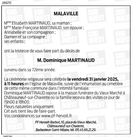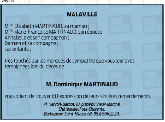 Cet espace « condoléances » est dédié à la mémoire de Monsieur Dominique MARTINAUD.