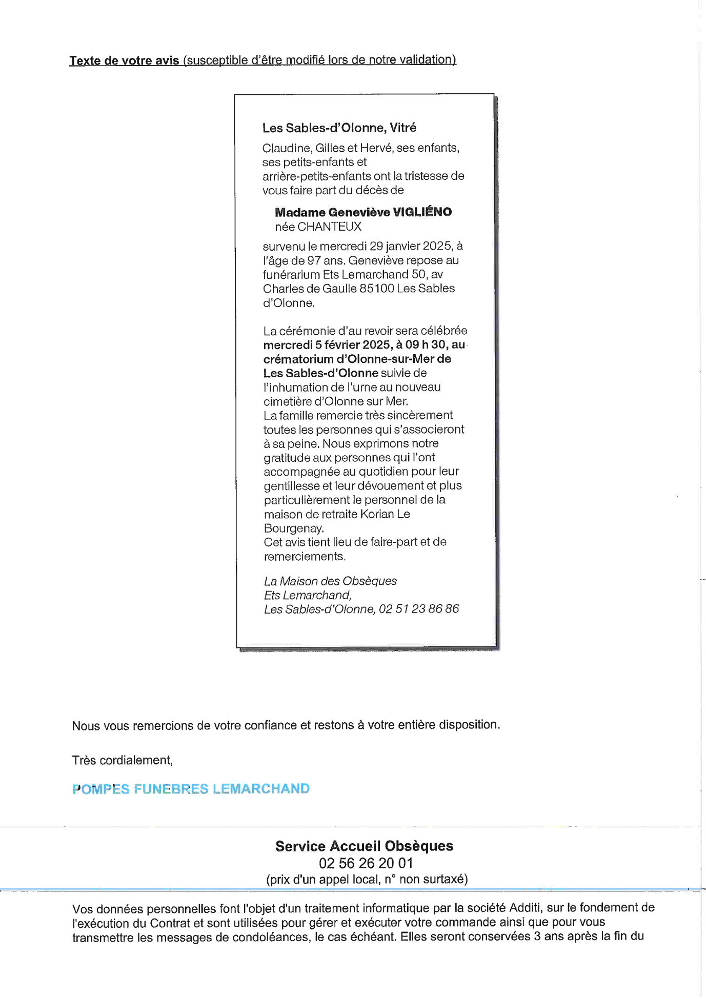 de Madame Geneviève VIGLIENO née CHANTEUX
