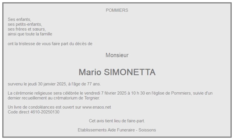 Cet espace « condoléances » est dédié à la mémoire de Monsieur Mario SIMONETTA.