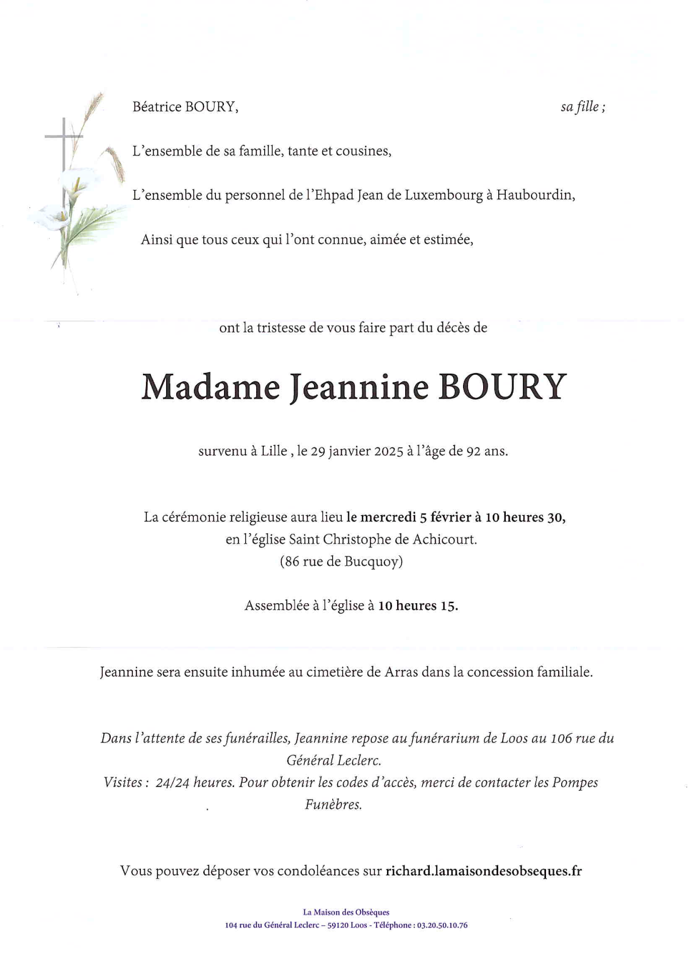 Cet espace « condoléances » est dédié à la mémoire de Madame Jeannine BOURY.