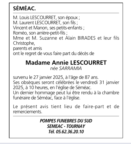 Cet espace « condoléances » est dédié à la mémoire de Madame Anne-Marie LESCOURRET née SARRAMIA.