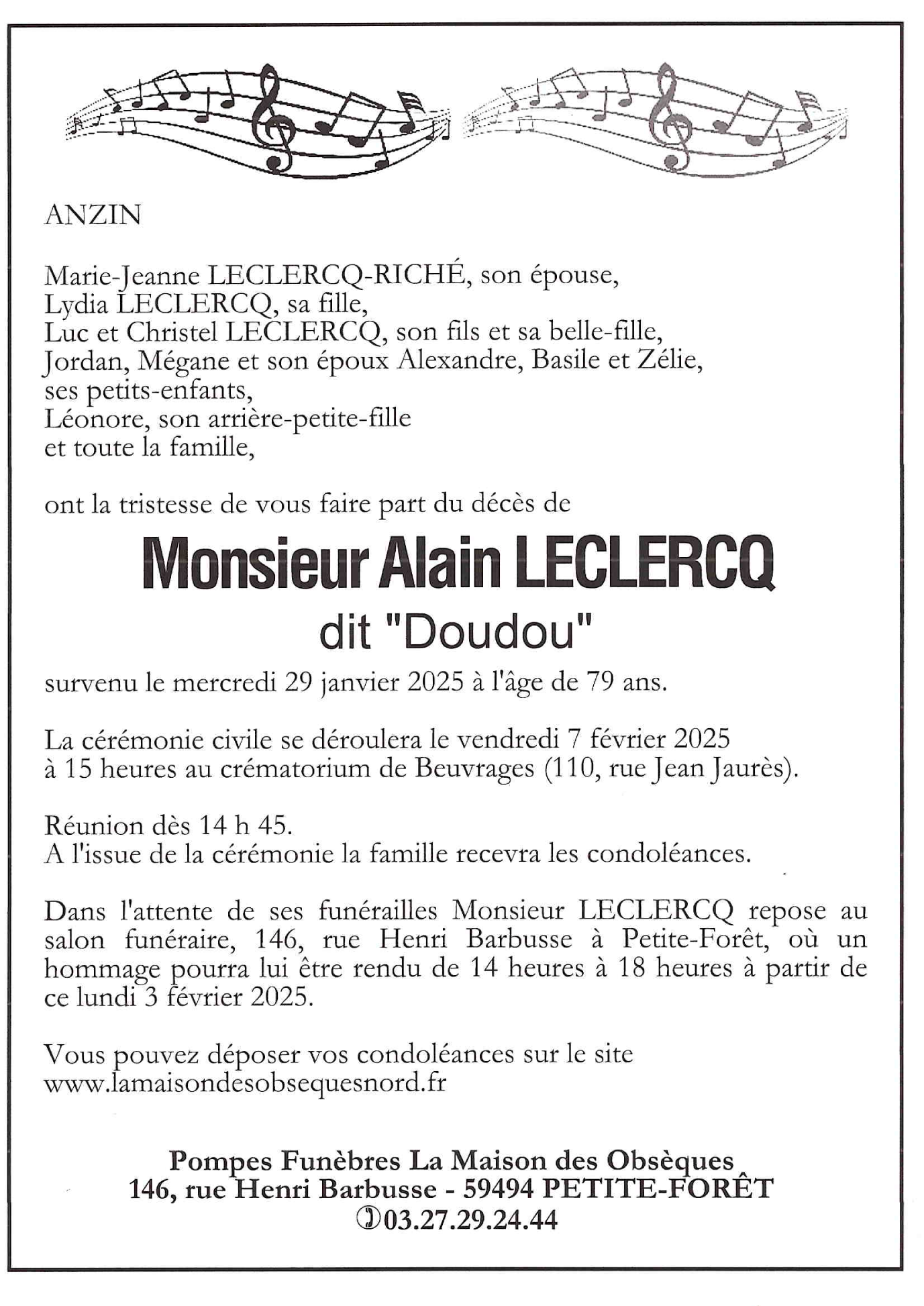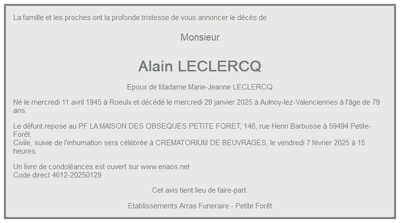 Cet espace « condoléances » est dédié à la mémoire de Monsieur Alain LECLERCQ.