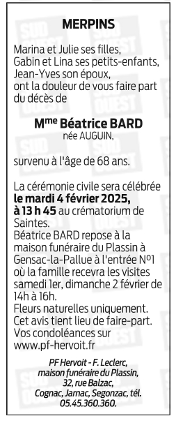 Cet espace « condoléances » est dédié à la mémoire de Madame Béatrice BARD née AUGUIN.