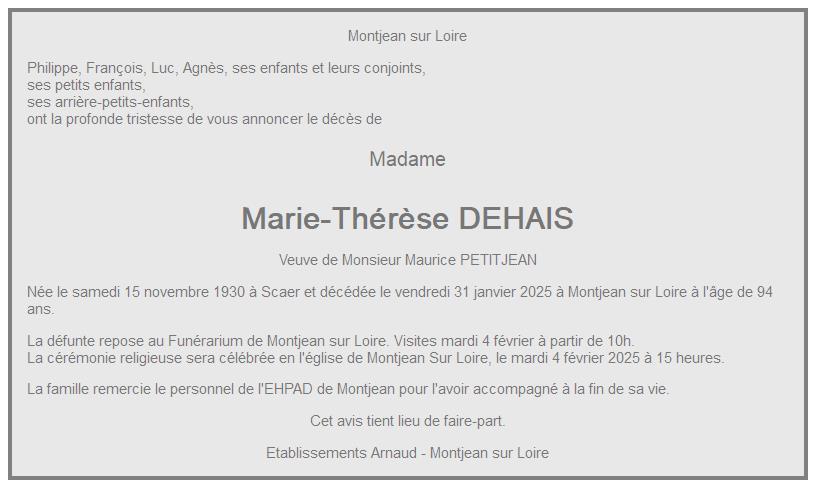 de Madame Marie-Thérèse PETITJEAN née DEHAIS