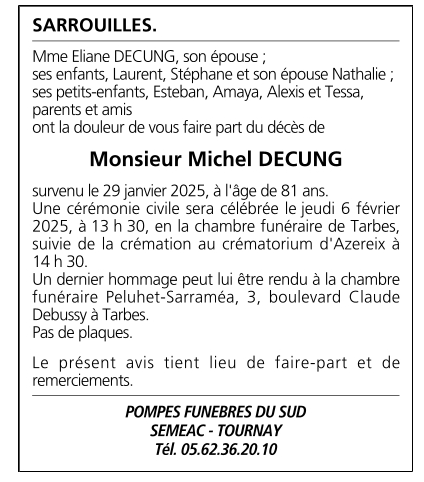 Cet espace « condoléances » est dédié à la mémoire de Monsieur Michel DECUNG.