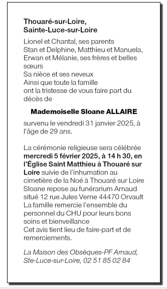 Cet espace « condoléances » est dédié à la mémoire de Madame Sloane ALLAIRE.