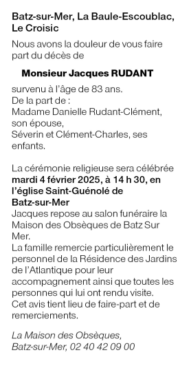 Décédé à Le Pouliguen (44510) le samedi 1 février 2025