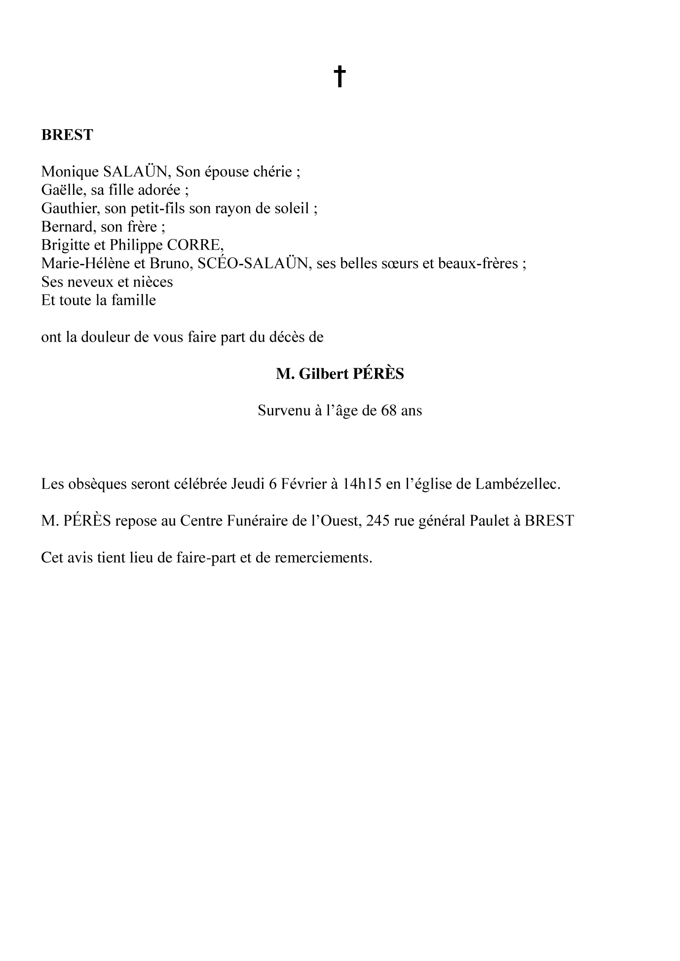 Cet espace « condoléances » est dédié à la mémoire de Monsieur Gilbert PÉRÈS.