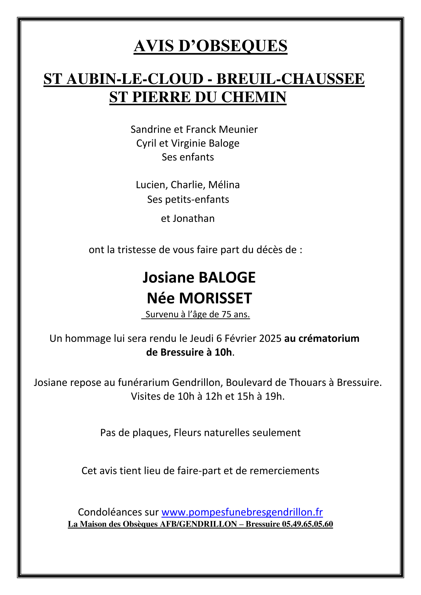 Cet espace « condoléances » est dédié à la mémoire de Madame Josiane BALOGE née MORISSET.
