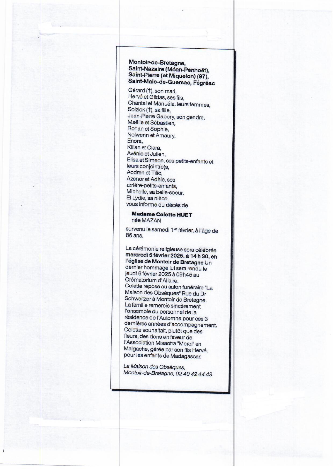 de Madame Colette HUET née MAZAN