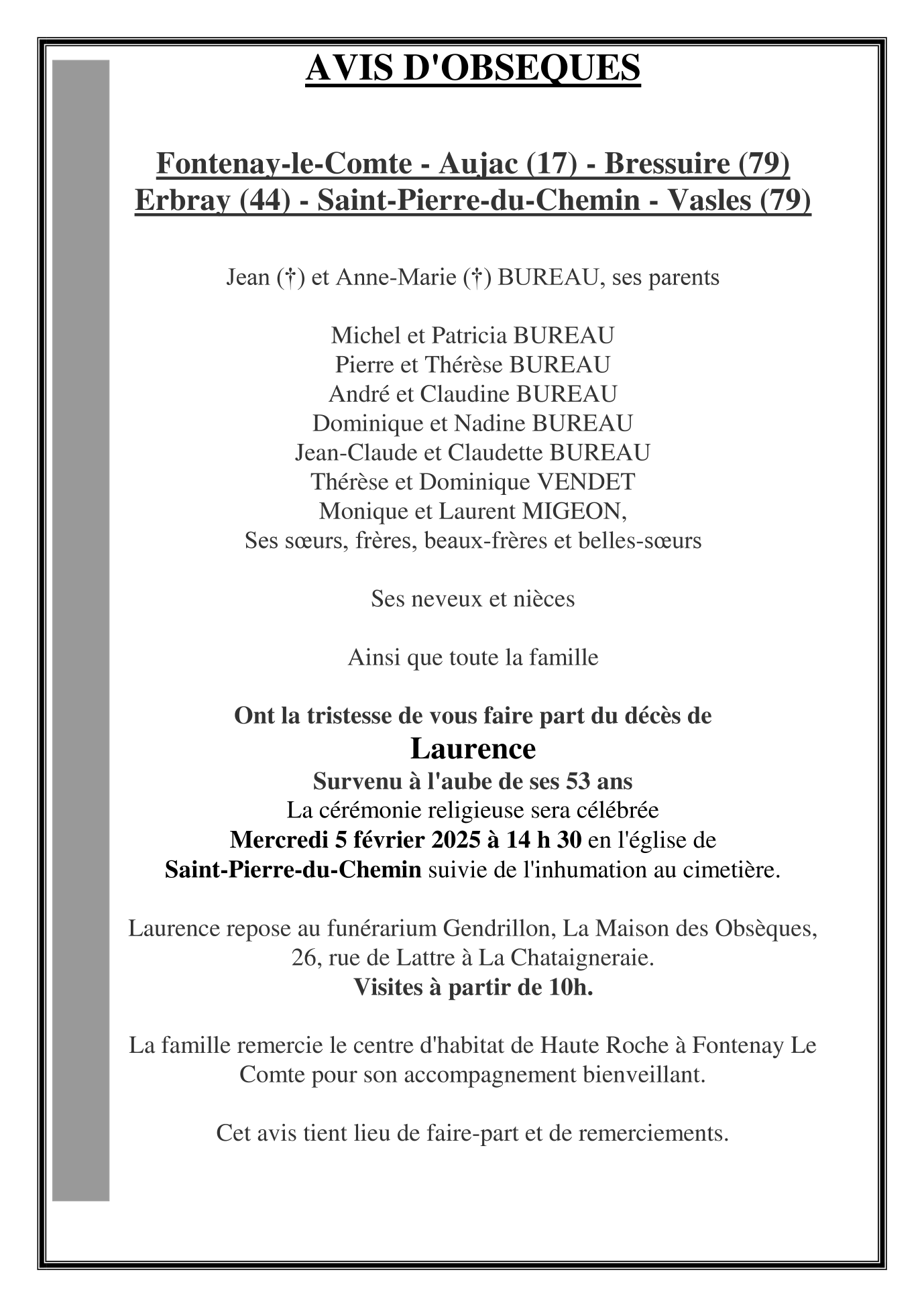 Cet espace « condoléances » est dédié à la mémoire de Madame Laurence BUREAU.