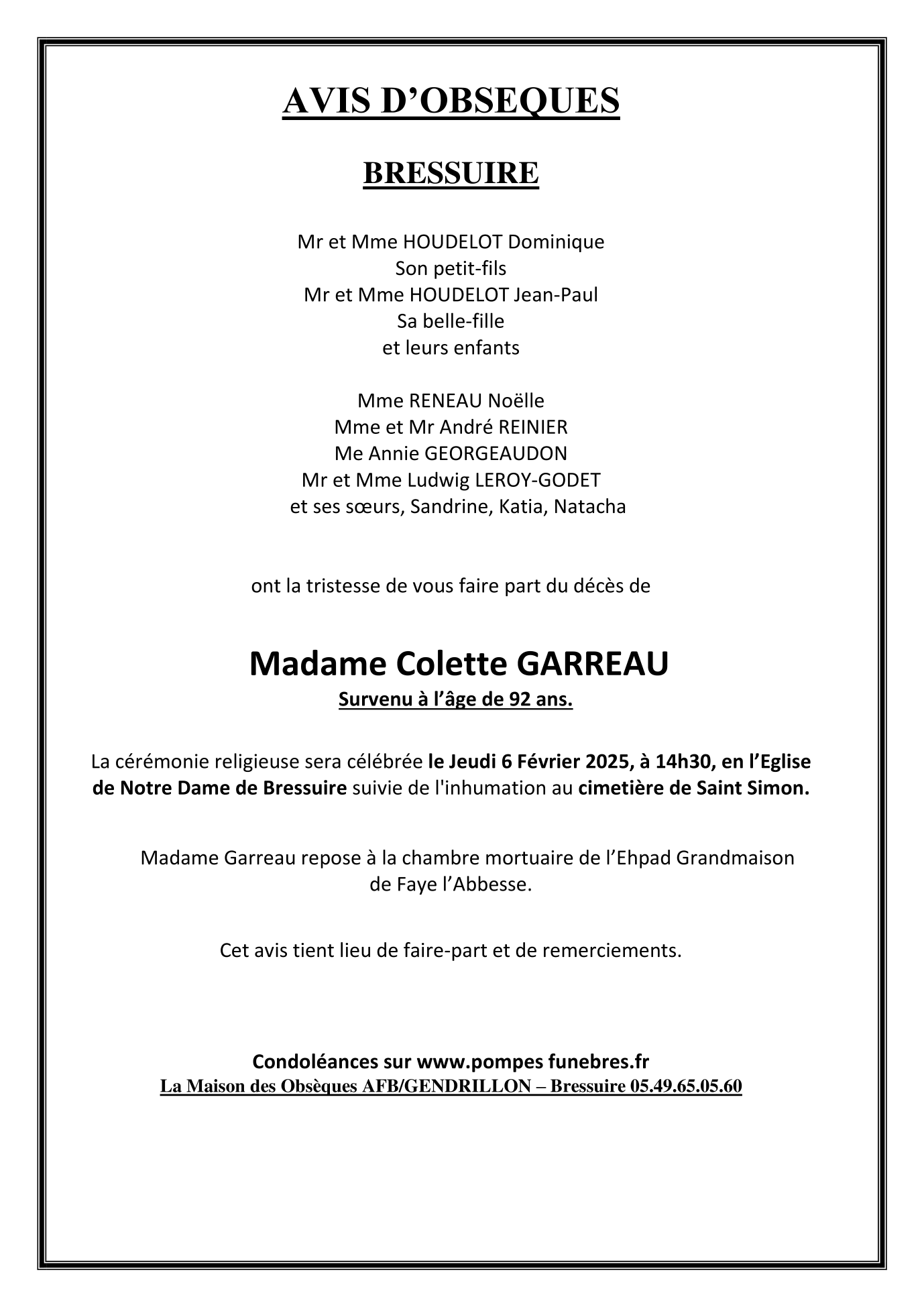 Cet espace « condoléances » est dédié à la mémoire de Madame Colette GARREAU née GRAVELEAU.
