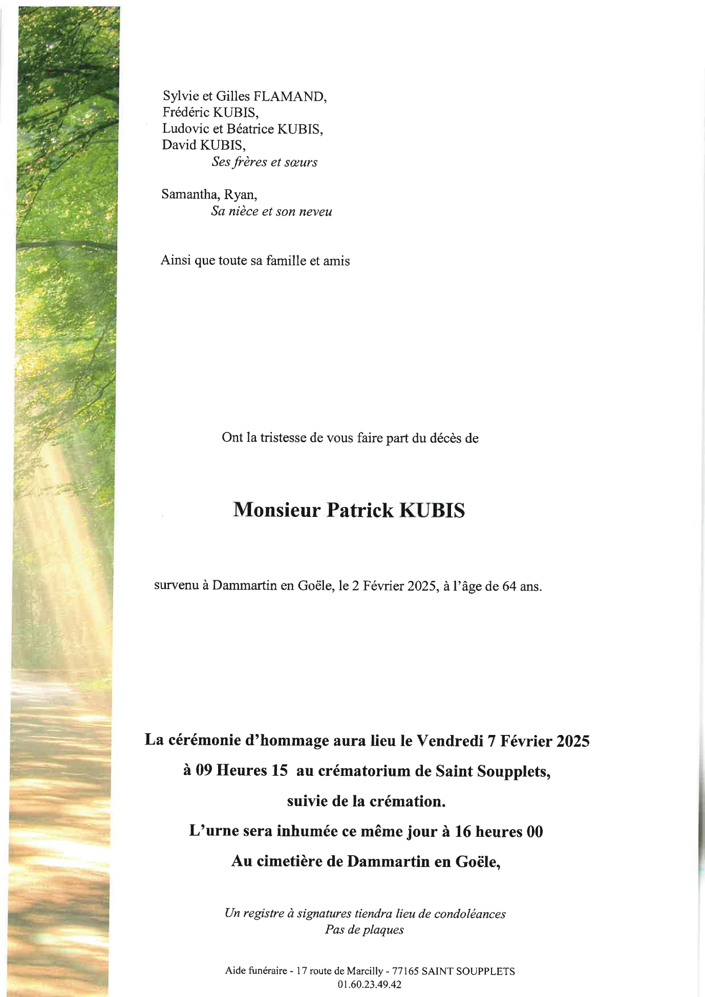 Cet espace « condoléances » est dédié à la mémoire de Monsieur Patrick KUBIS.