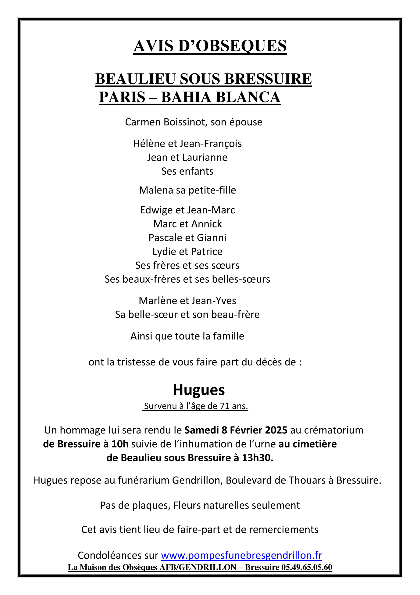 Cet espace « condoléances » est dédié à la mémoire de Monsieur Hugues BOISSINOT.