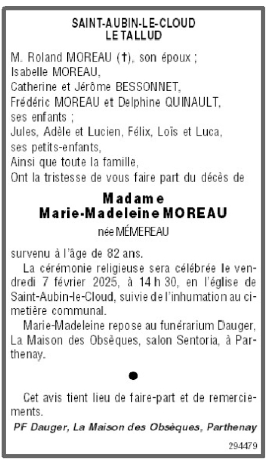 de Madame Marie-Madeleine MOREAU née MÉMEREAU