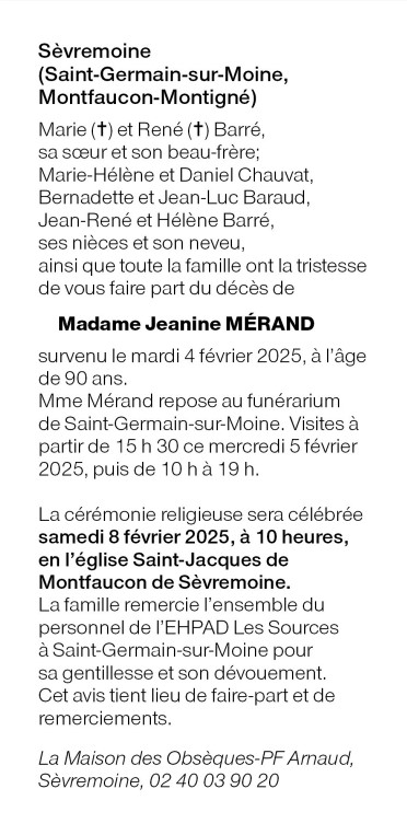Cet espace « condoléances » est dédié à la mémoire de Madame Jeanine MÉRAND.