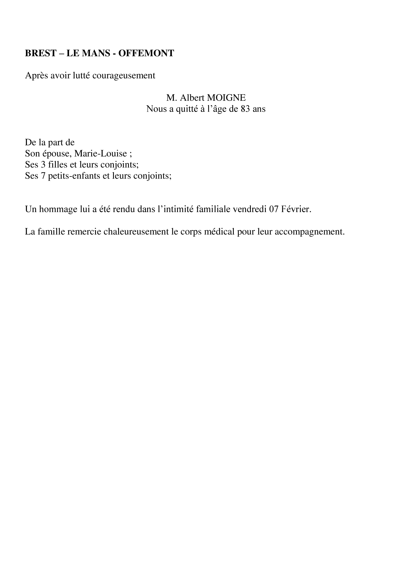 Cet espace « condoléances » est dédié à la mémoire de Monsieur Albert MOIGNE.