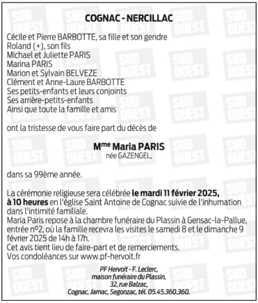 Cet espace « condoléances » est dédié à la mémoire de Madame Maria PARIS née GAZENGEL.