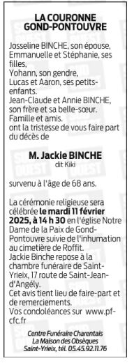 Cet espace « condoléances » est dédié à la mémoire de Monsieur Jackie BINCHE.