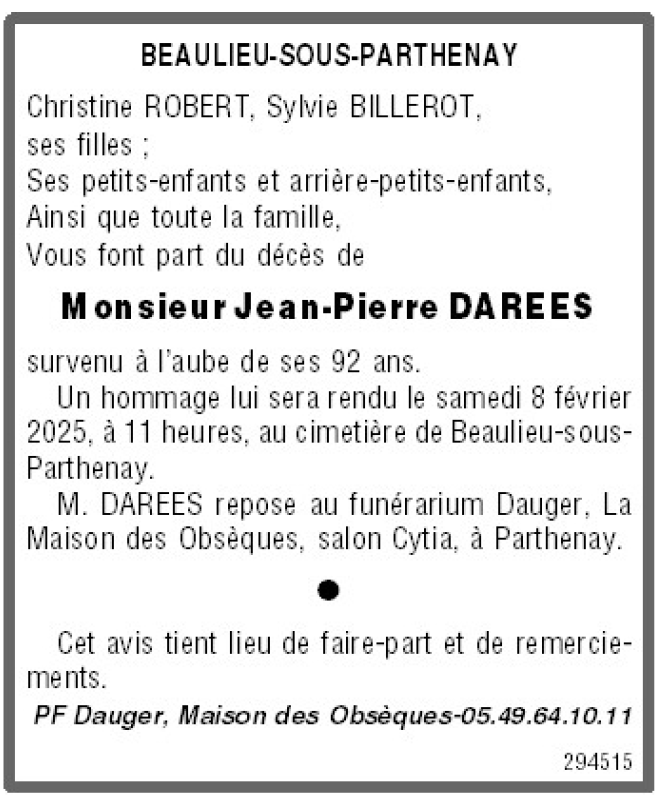 Décédé à Beaulieu-sous-Parthenay (79420) le mardi 4 février 2025