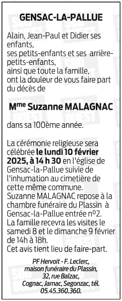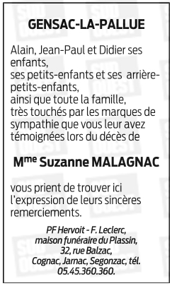 Cet espace « condoléances » est dédié à la mémoire de Madame Suzanne MALAGNAC.