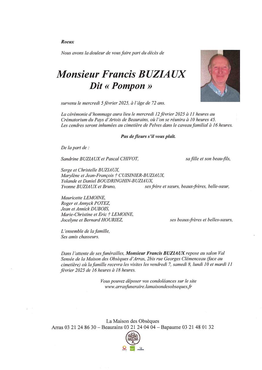 Cet espace « condoléances » est dédié à la mémoire de Monsieur Francis BUZIAUX.