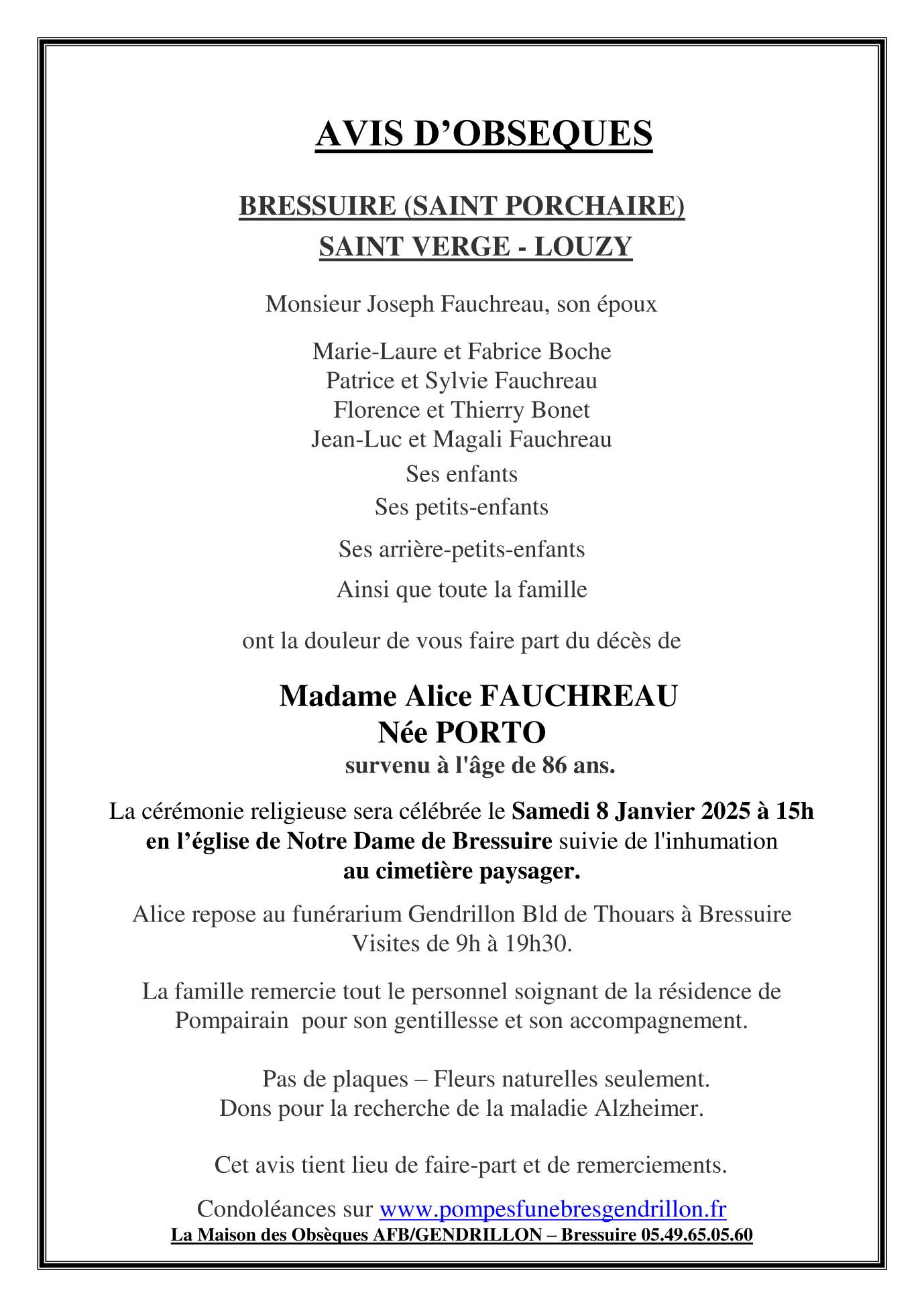 de Madame Alice FAUCHREAU née PORTO