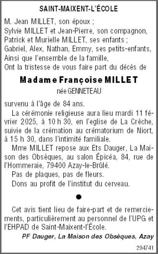 Cet espace « condoléances » est dédié à la mémoire de Madame Françoise MILLET née GENNETEAU.