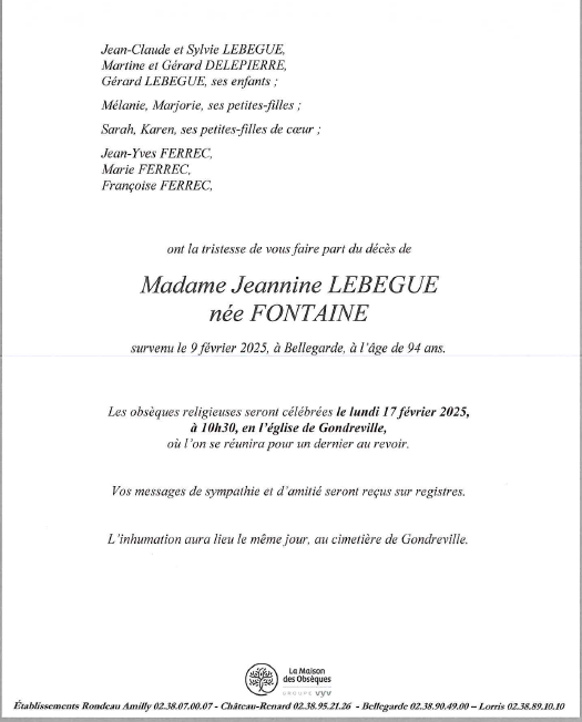 de Madame Jeannine LEBEGUE née FONTAINE
