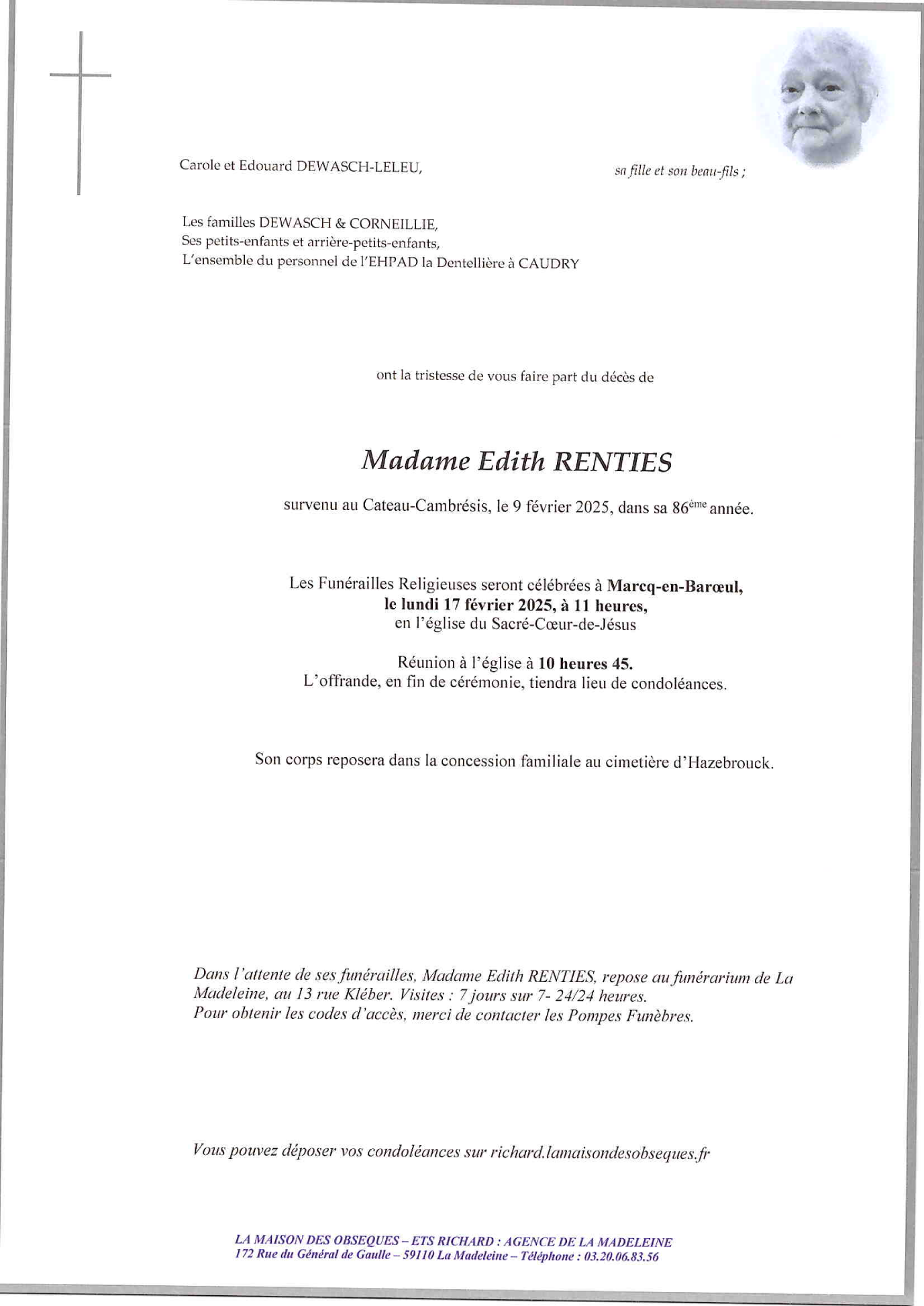Cet espace « condoléances » est dédié à la mémoire de Madame Edith RENTIES.
