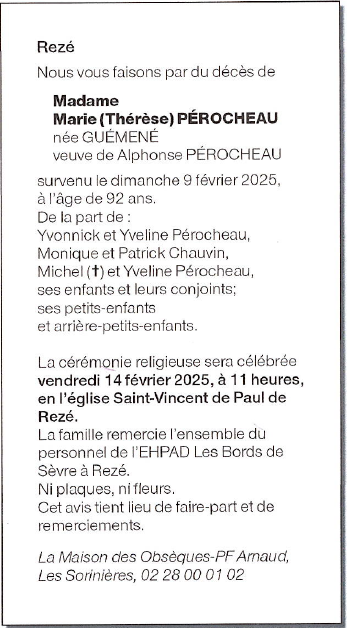 Cet espace « condoléances » est dédié à la mémoire de Madame Marie PEROCHEAU (née GUÉMENÉ).