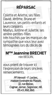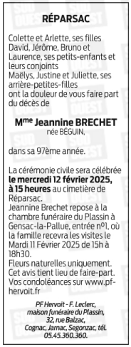 Cet espace « condoléances » est dédié à la mémoire de Madame Jeannine BRECHET née BÉGUIN.