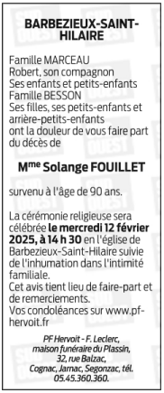 Cet espace « condoléances » est dédié à la mémoire de Madame Solange FOUILLET.