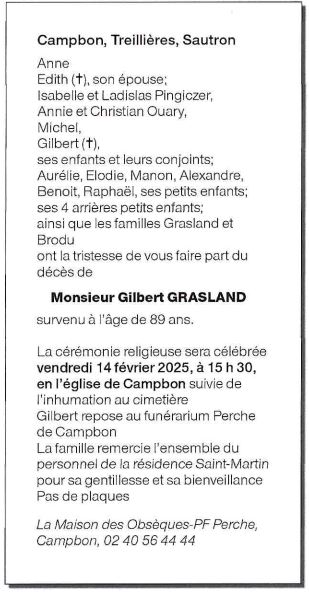 Cet espace « condoléances » est dédié à la mémoire de Monsieur Gilbert GRASLAND.