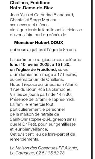 Cet espace « condoléances » est dédié à la mémoire de Monsieur Hubert DOUX.