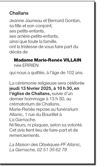 Cet espace « condoléances » est dédié à la mémoire de Madame Marie-Renée VILLAIN née ERRIEN.