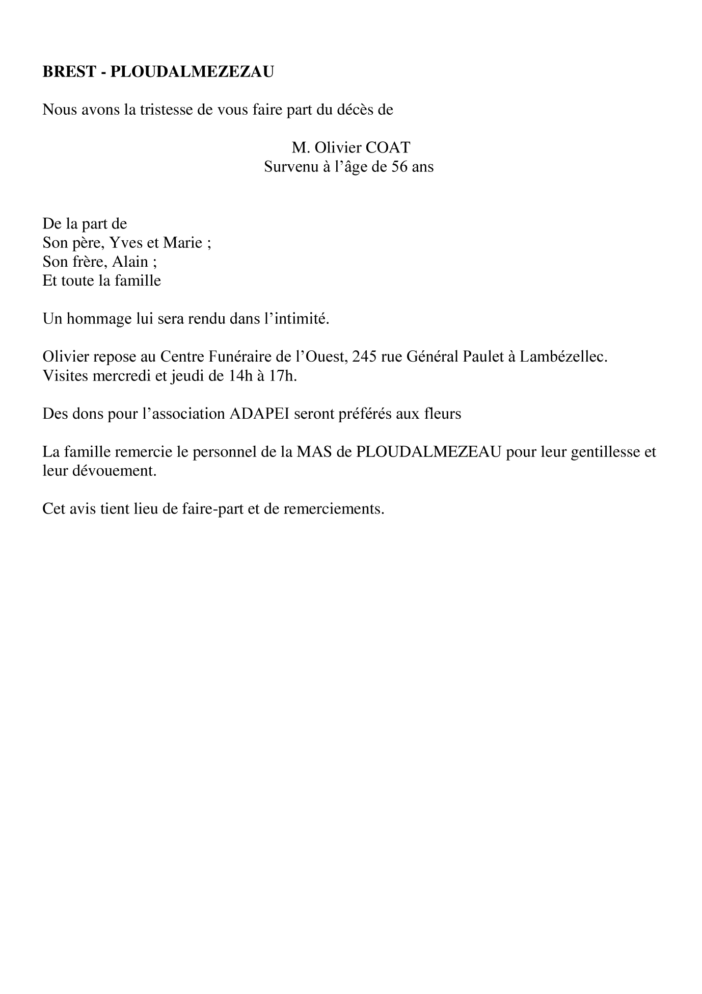 Cet espace « condoléances » est dédié à la mémoire de Monsieur Olivier COAT.
