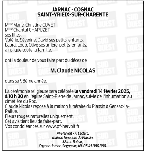 Cet espace « condoléances » est dédié à la mémoire de Monsieur Claude NICOLAS.