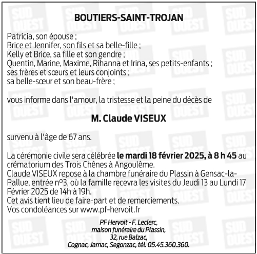 Cet espace « condoléances » est dédié à la mémoire de Monsieur Claude VISEUX.