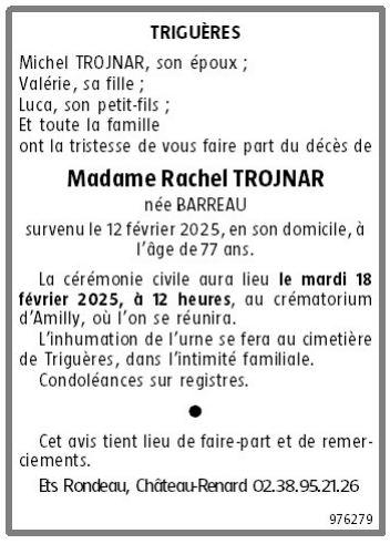 Cet espace « condoléances » est dédié à la mémoire de Madame Rachel TROJNAR née BARREAU.