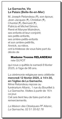 Cet espace « condoléances » est dédié à la mémoire de Madame Eugénie RELANDEAU née GUYOT.