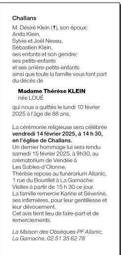 Cet espace « condoléances » est dédié à la mémoire de Madame Marie-Thérèse KLEIN née LOUÉ.