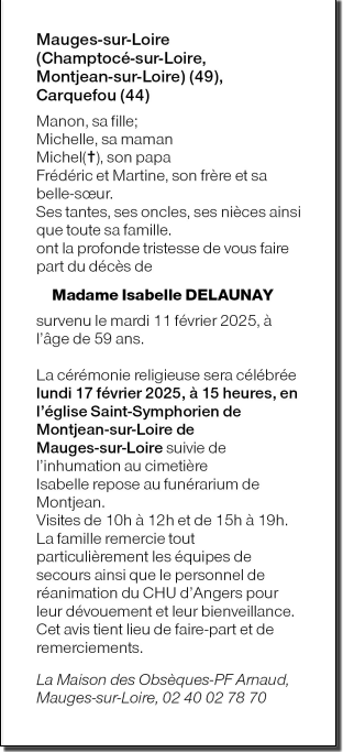 Cet espace « condoléances » est dédié à la mémoire de Madame Isabelle DELAUNAY.