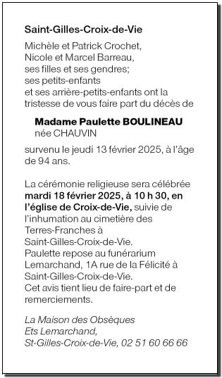 Cet espace « condoléances » est dédié à la mémoire de Madame Paulette BOULINEAU née CHAUVIN.