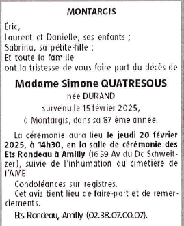 Cet espace « condoléances » est dédié à la mémoire de Madame Simone QUATRESOUS née DURAND.
