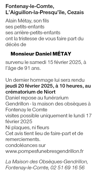 Cet espace « condoléances » est dédié à la mémoire de Monsieur Daniel METAY.