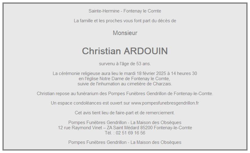 Cet espace « condoléances » est dédié à la mémoire de Monsieur Christian ARDOUIN.