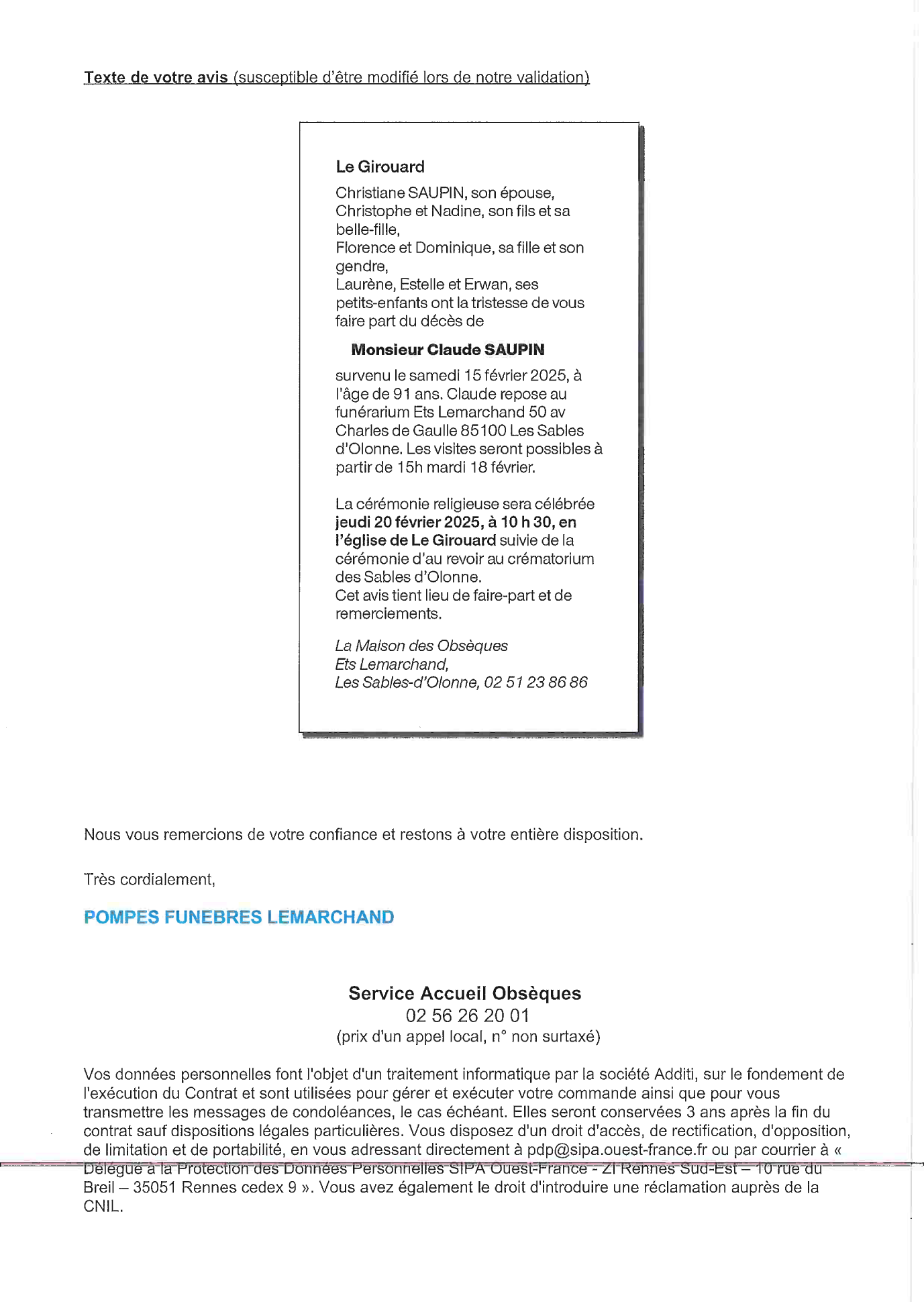 Cet espace « condoléances » est dédié à la mémoire de Monsieur Claude SAUPIN.