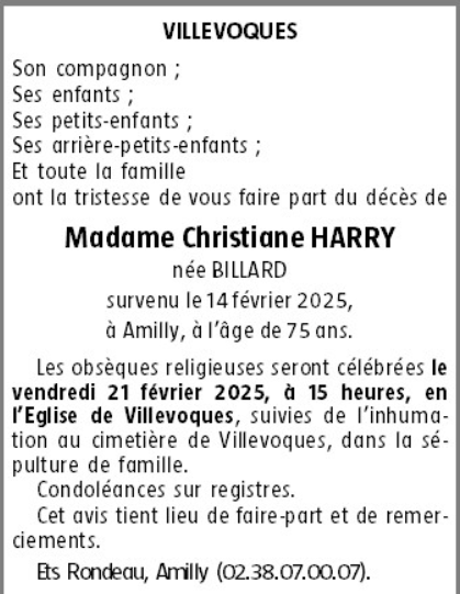 de Madame Christiane HARRY née BILLARD